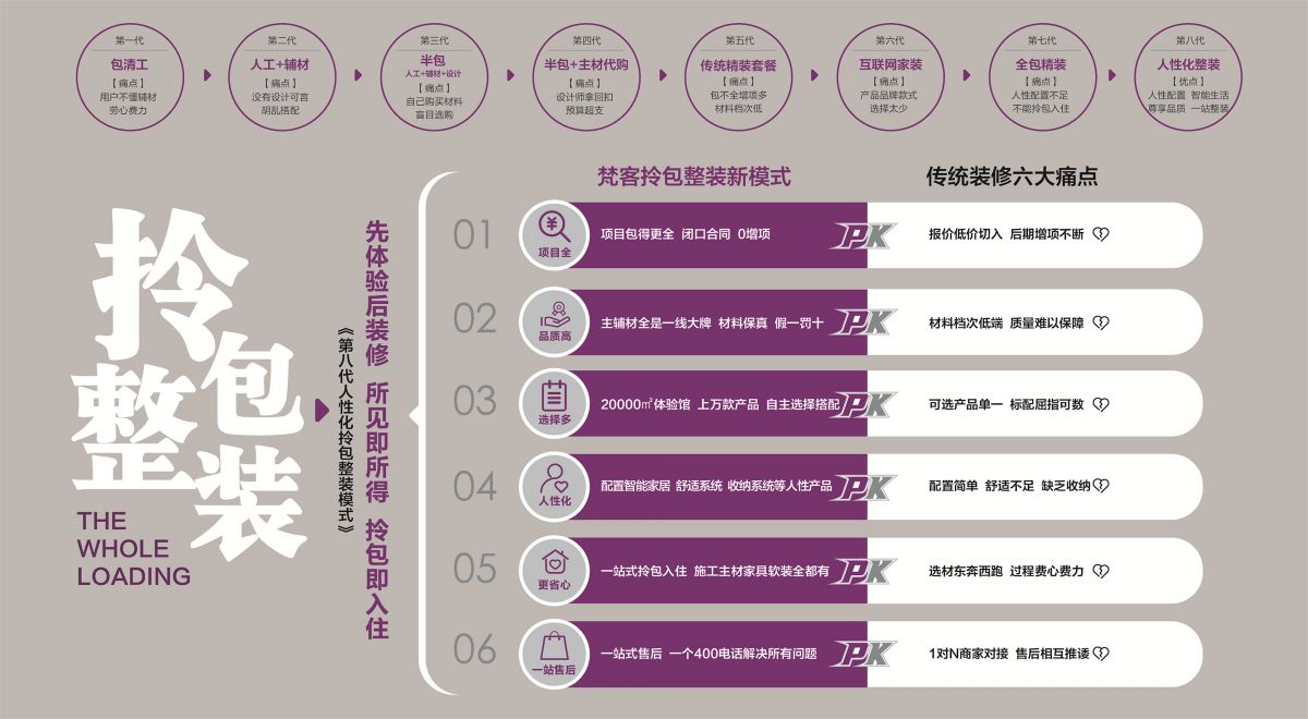 在產品打磨上,基于消費者痛點,梵客家裝研發推出整裝模式,一站式家裝解決方案,業內首創提出第八代人性化拎包整裝理念,引領整裝發展潮流。該模式消除了傳統套餐的頑疾,因品質高、選擇多、配置透明等優勢,獲得用戶一致認可,讓裝修更省錢省心,更環保。