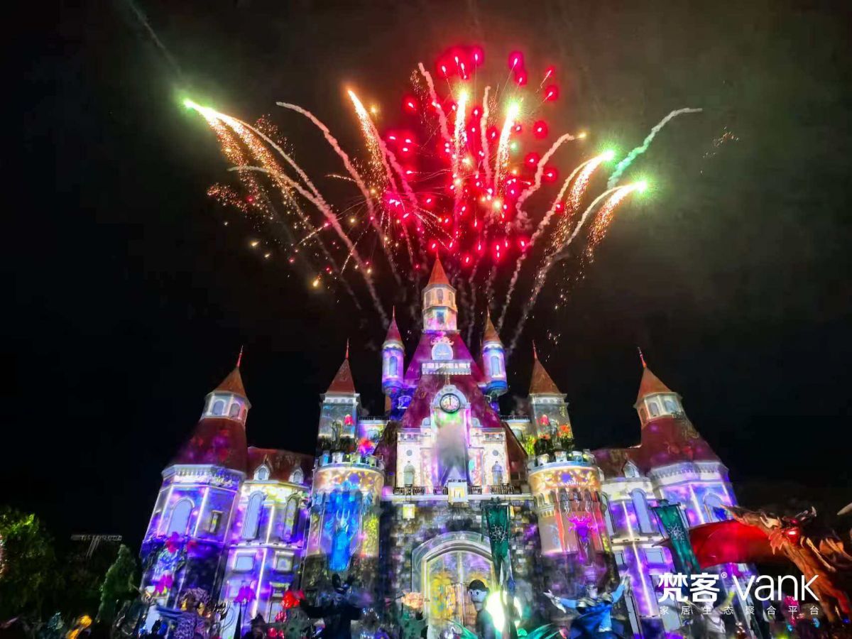 直至夜色完全降臨,觀賞項目又為大家放出一顆巨型彩蛋,音樂噴泉、煙花秀隆重上演,城堡因閃爍的光芒而變得富麗堂皇、空中盛開的煙花點亮了整個夜空…大家舉目仰望,共同祈愿此刻的繁花似錦定格成永恒的星光璀璨。
