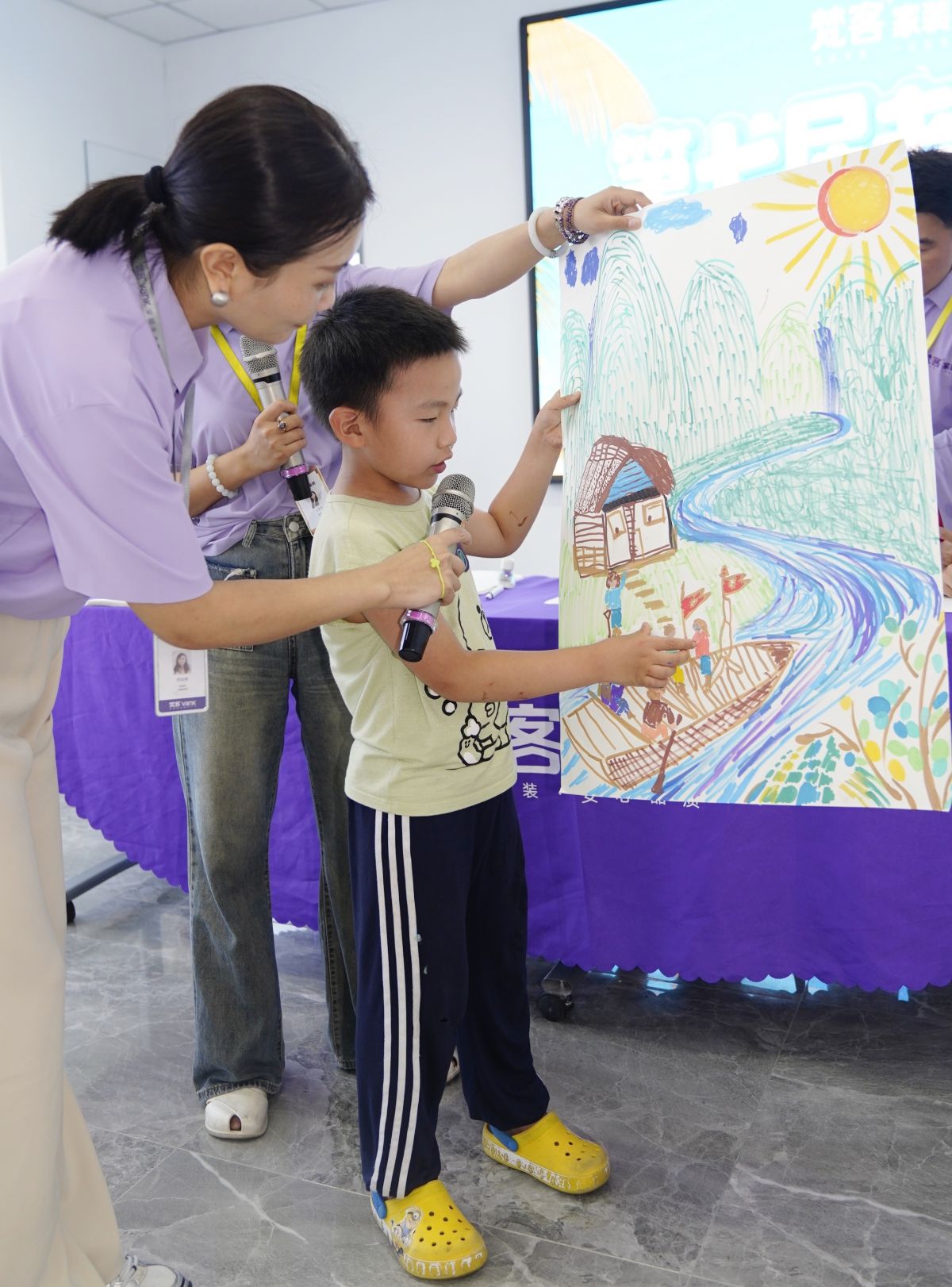 隨后,小朋友向大家講述了自己的繪畫(huà)思路,“我畫(huà)的是軍艦,可以保家衛(wèi)國(guó)...我希望它能帶我去看這個(gè)世界…我想和爸爸媽媽一起去釣魚(yú)…我的船順著小溪穿越森林,周?chē)娘L(fēng)景一定很美…”