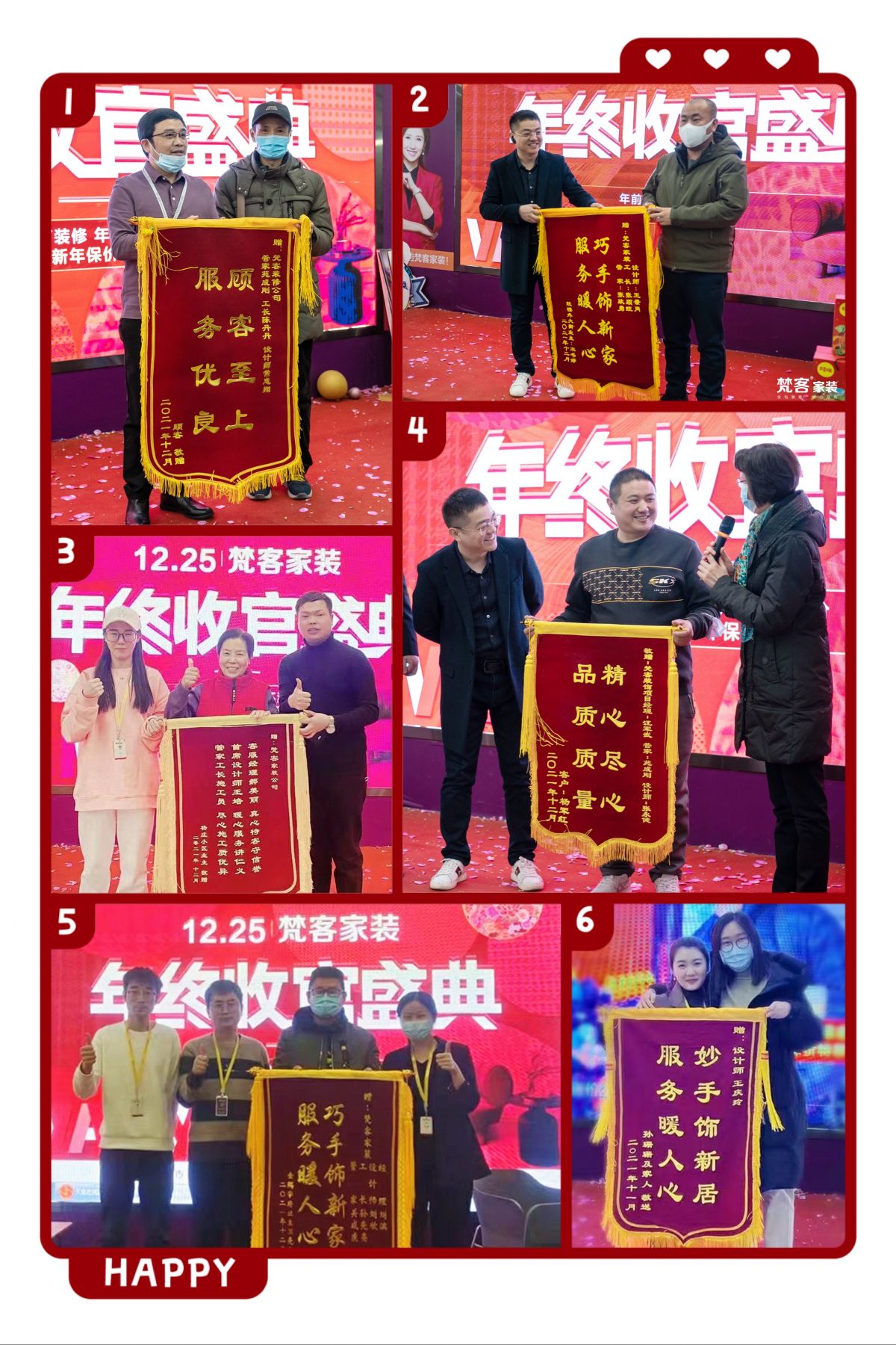 梵客的年終收官盛典可謂榮耀之夜,眾多業主送上錦旗,贊賞裝修流程非常規范化,前期對接客服很有耐心,中期對設計也滿意,工人手藝精湛,環保也做的好,讓人感到很踏實。